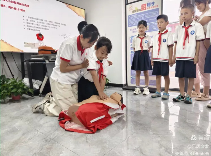“大家先摸摸自己的颈动脉——对,就在脖子侧面,像小火车一样‘咚咚’跳的地方。”李教官举起模型人偶,声音洪亮又亲切。孩子们立刻好奇地互相在同伴脖子上摸索,有人没找准位置急得小声嘀咕,旁边立刻有“小老师”凑过去指点,笑声混着“找到了!找到了!”的欢呼,一下子打破了严肃的氛围。