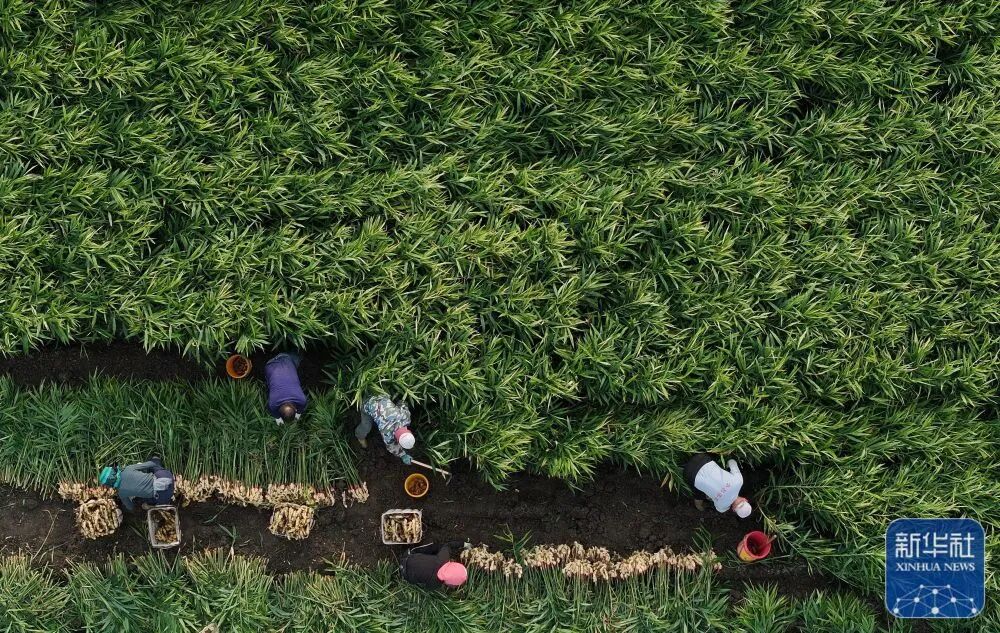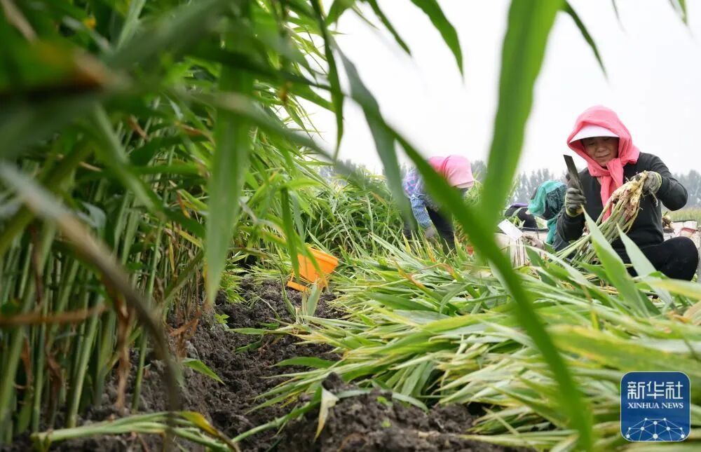 ↑10月7日,河北唐山市丰润区新军屯镇的农民在田间收获生姜。