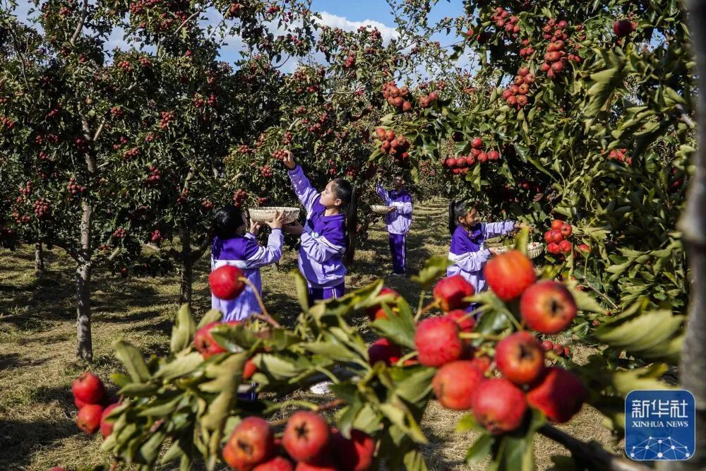 10月10日,遵化市刘备寨乡山头庄小学的学生在果园采摘山楂。