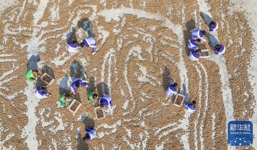 10月10日,遵化市东旧寨镇梁屯中心小学的学生在场院精选核桃(无人机照片)。