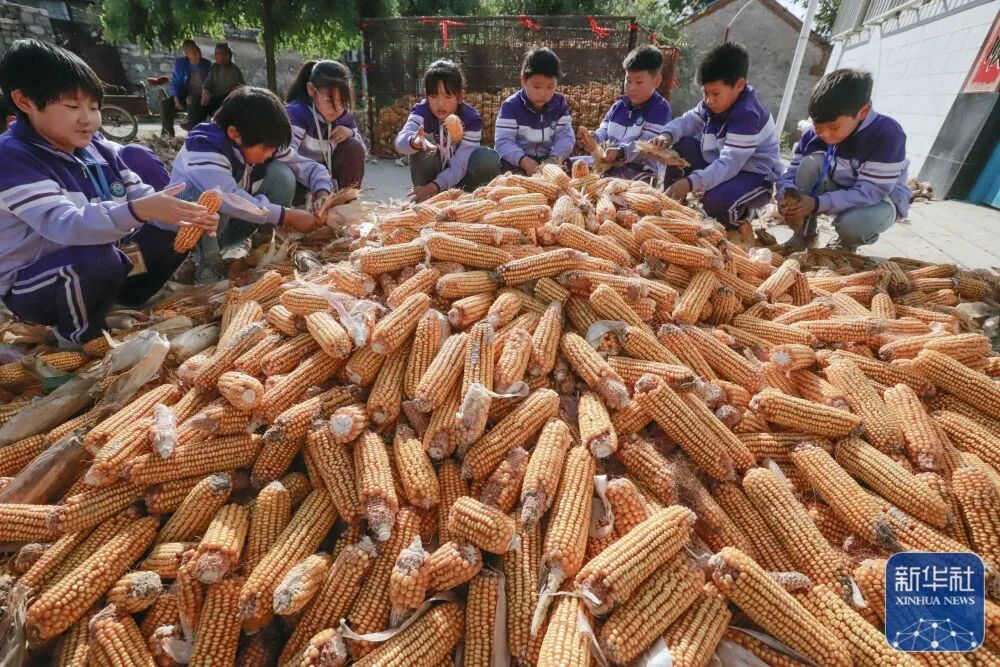 10月10日,遵化市刘备寨乡山头庄小学的学生在场院剥玉米皮。