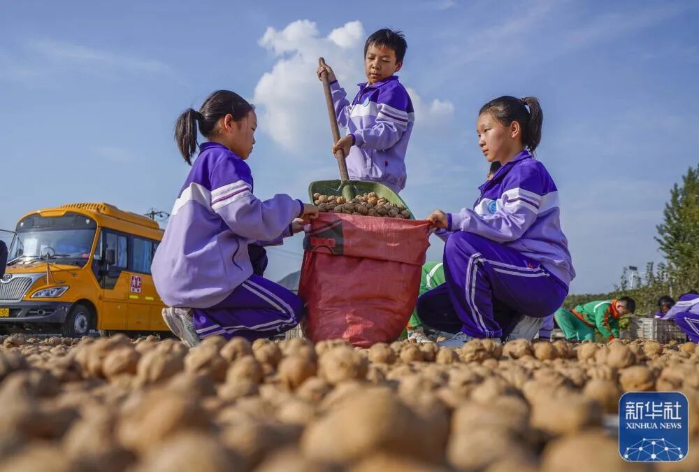10月10日,遵化市东旧寨镇梁屯中心小学的学生在场院将核桃装袋。