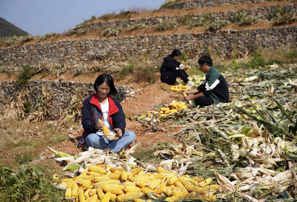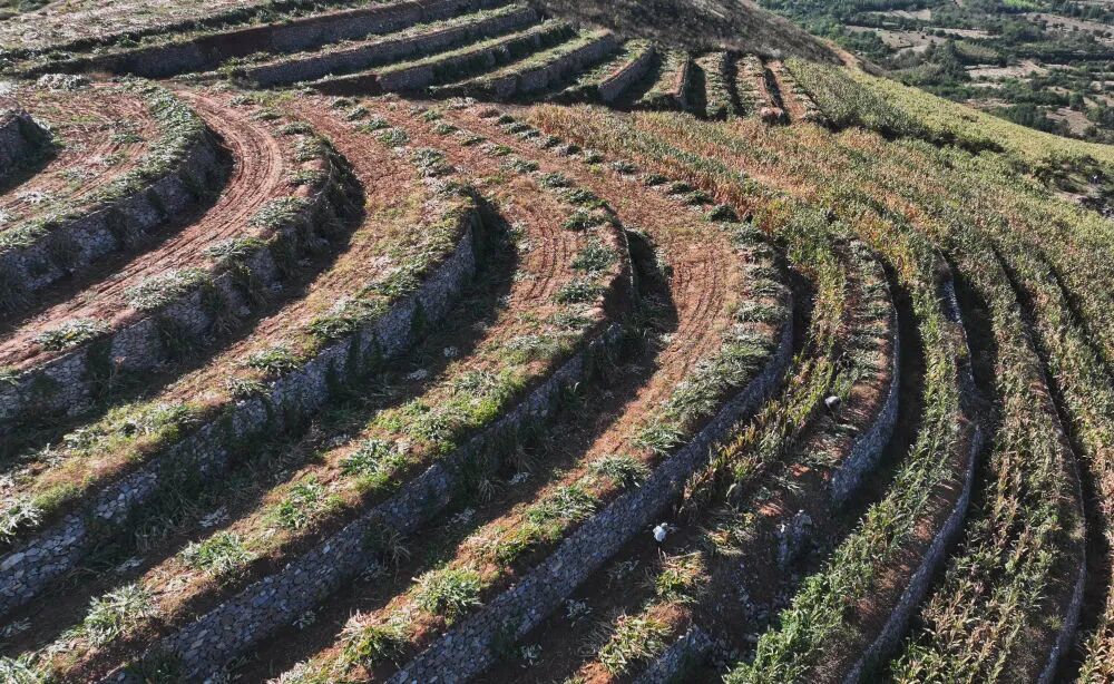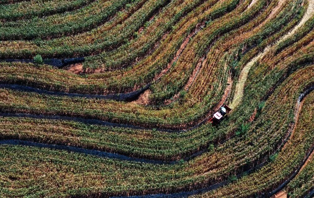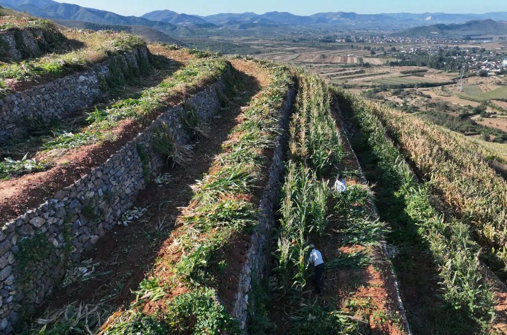 金秋时节,在河北省遵化市刘备寨乡由丘陵坡地改造成的梯田中,农民抢抓农时收获玉米等秋粮。近年来,遵化市大力实施土地整治工程,将浅山丘陵坡地和荒草地改造成保水保肥的水平梯田,促进农业增效、农民增收。新华社记者 杨世尧