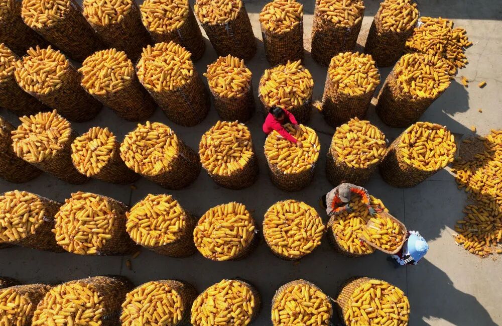 ↑10月10日,河北省遵化市刘备寨乡尚庄屯村的农民将收获的玉米装入粮囤(无人机照片)。新华社记者 杨世尧 摄