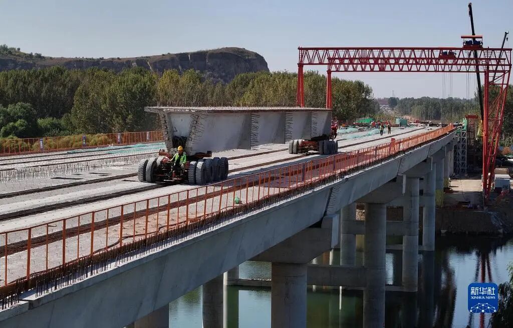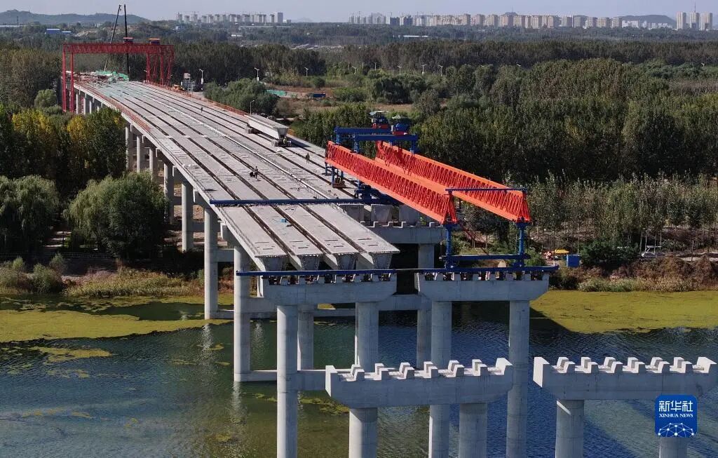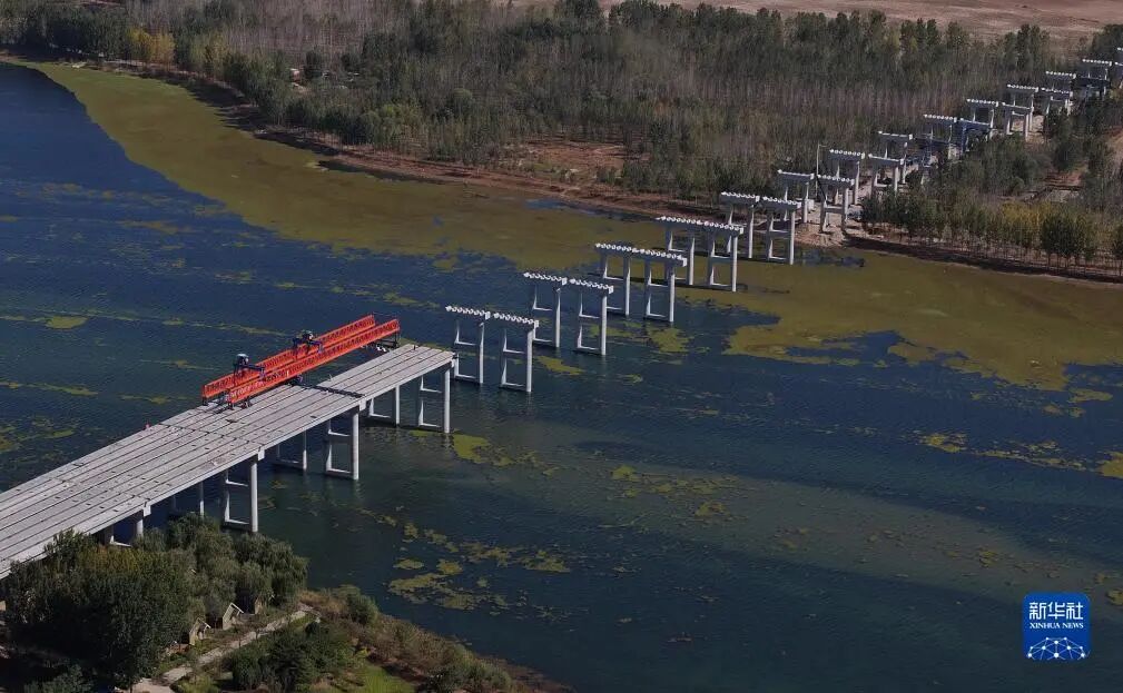 10月17日,工人在唐山滦州市内的秦唐高速公路跨滦河大桥建设工地施工(无人机照片)。