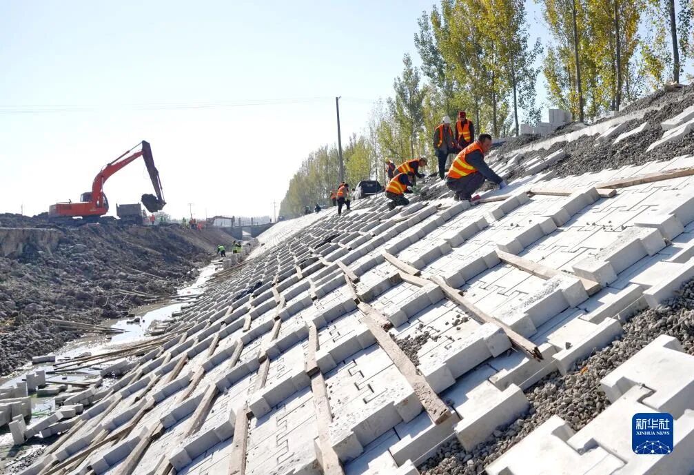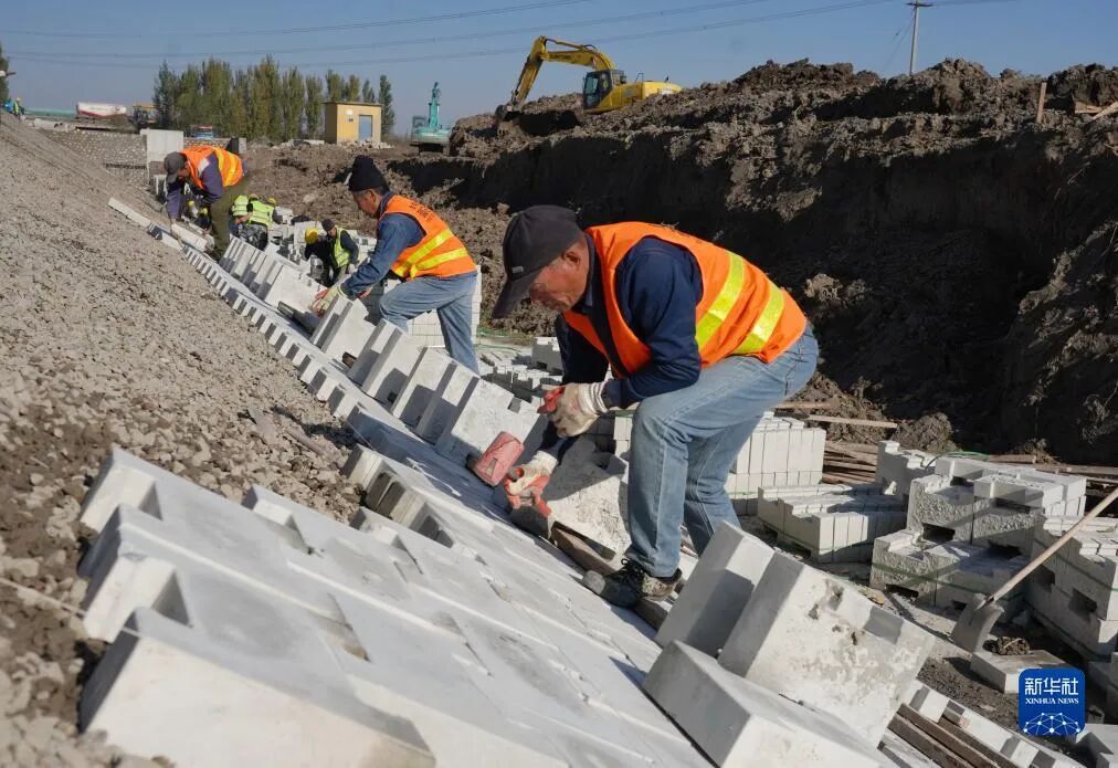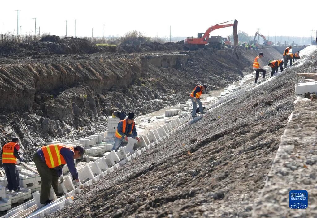 11月7日,工人在唐山市丰南区王兰庄镇彭家庄村灌溉水渠护坡加固工地施工。