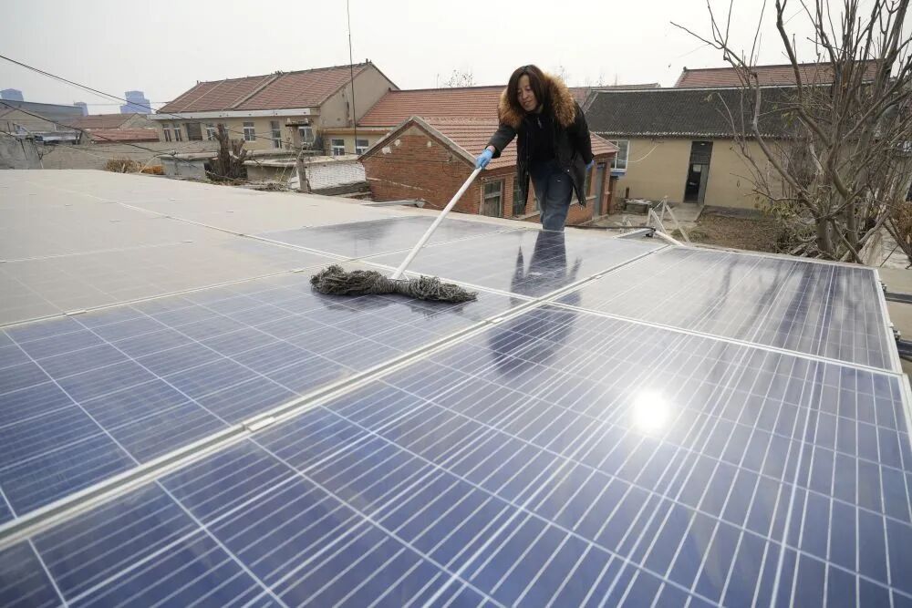 ↑ 12月10日,河北省玉田县林头屯乡东芦庄村村民在清洁自家房顶的光伏发电板。