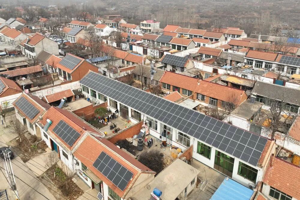 ↑河北省玉田县郭家屯镇四角山村内的屋顶光伏发电设备(12月10日摄,无人机照片)。