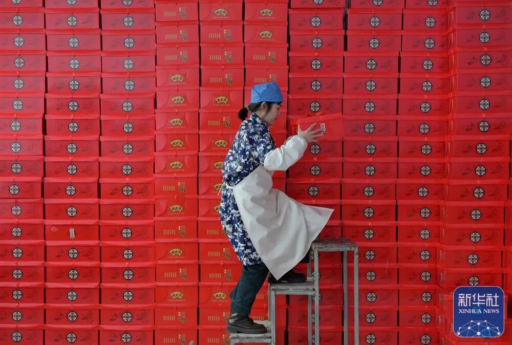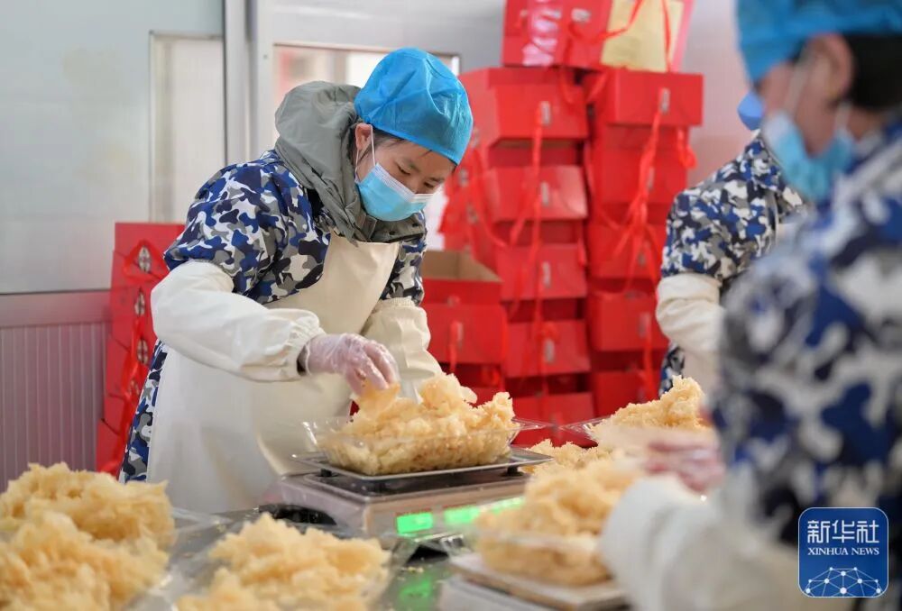 ↑12月29日,工人在唐山市丰润区一家传统手工麻糖厂的成品车间工作。