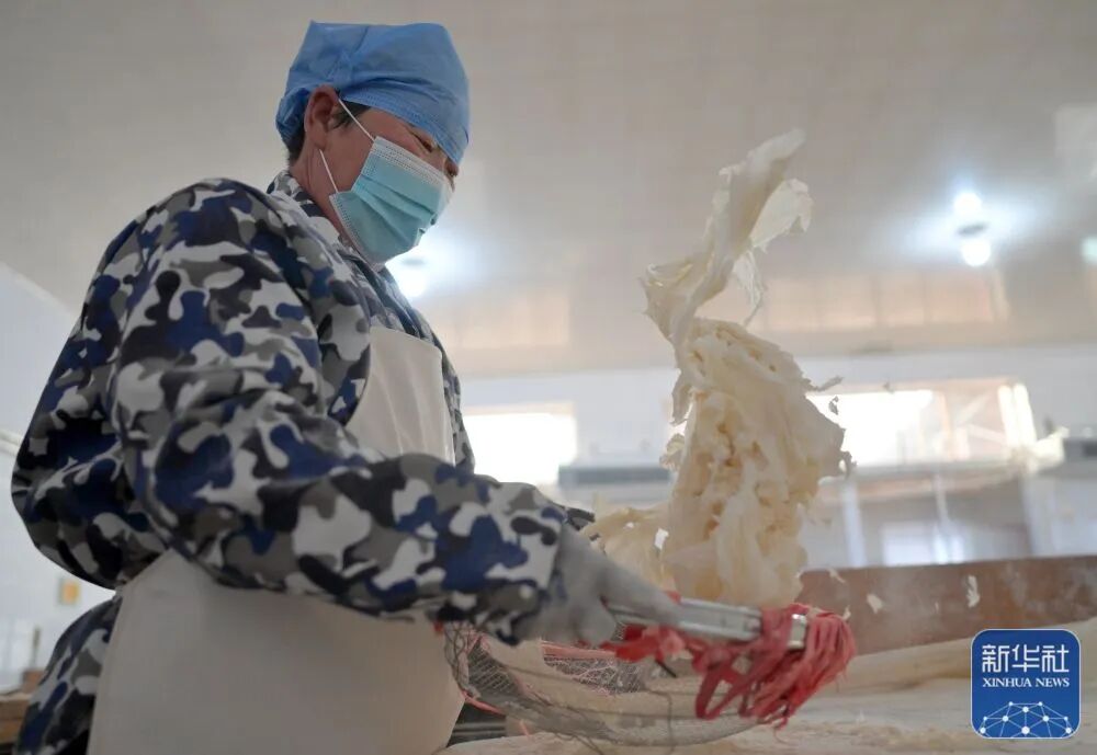 ↑12月29日,工人在唐山市丰润区一家传统手工麻糖厂的生产车间工作。