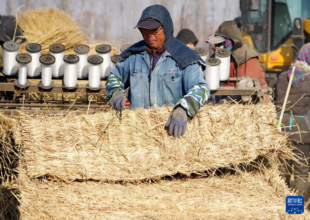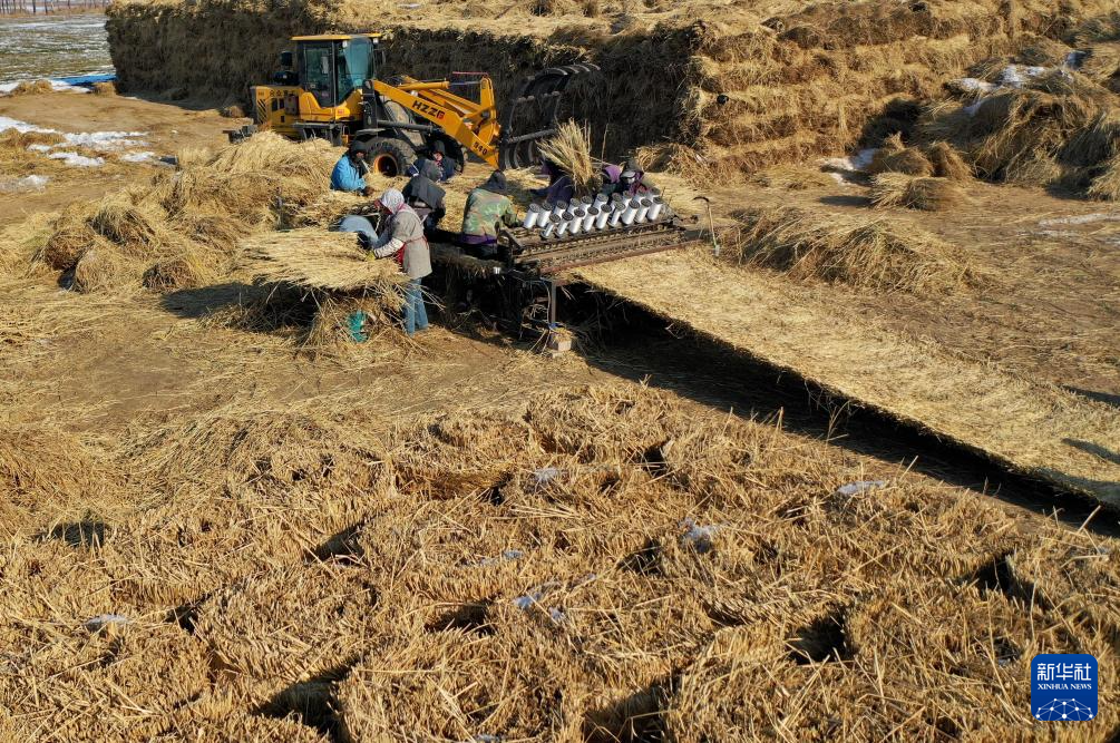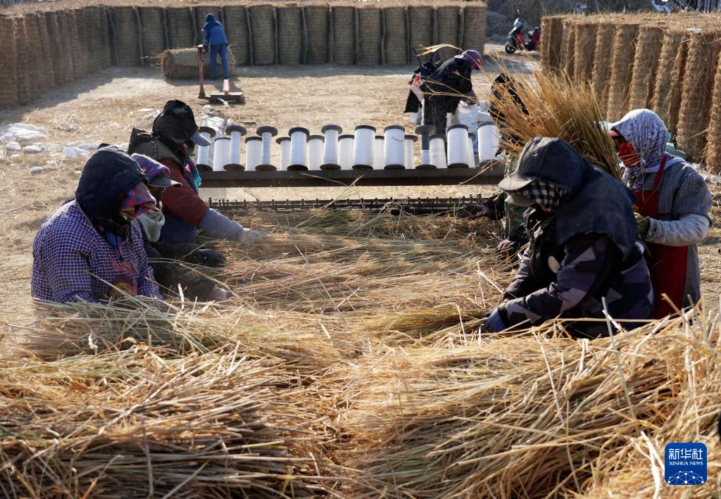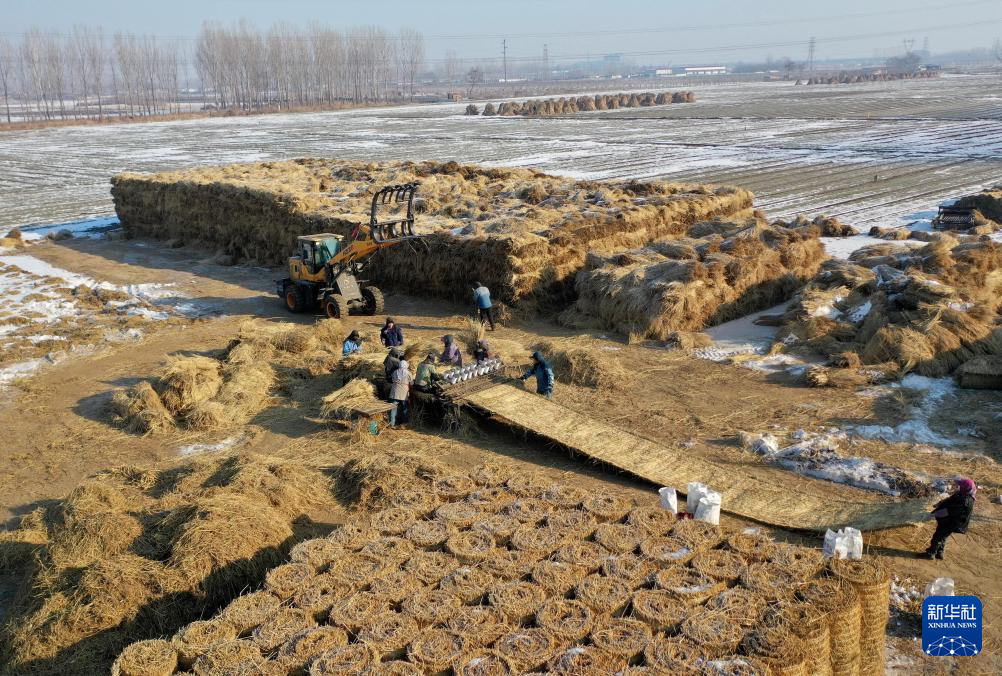 1月12日,河北省唐山市丰南区西葛镇一家有机水稻种植合作社的社员用回收的稻草编制草帘。