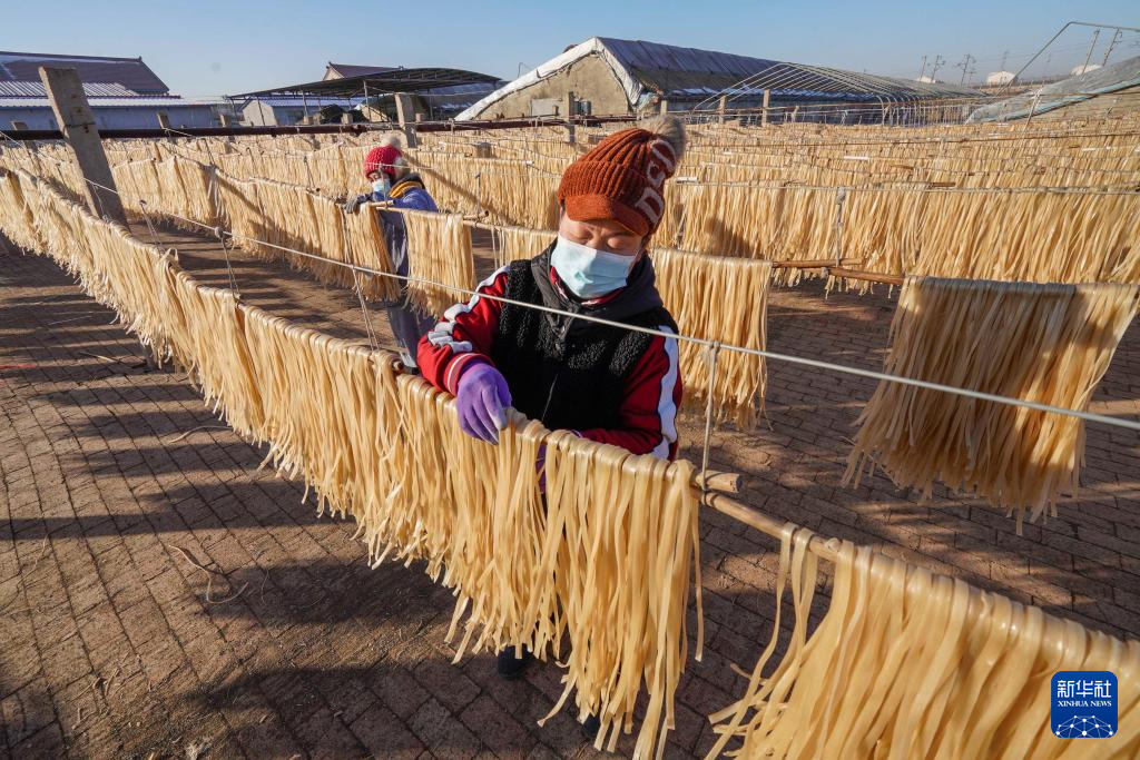 春节前夕,河北省遵化市平安城镇各粉条加工专业合作社的场院一片忙碌,农民们利用晴好天气晾晒粉条,供应节日市场。