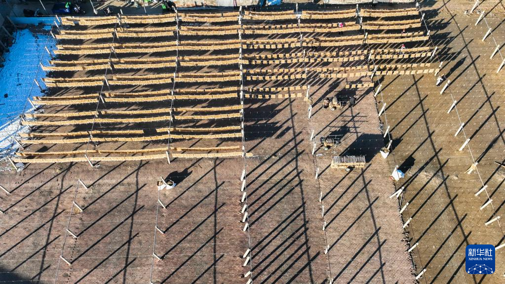 1月15日,农民在河北省遵化市平安城镇一家粉条加工专业合作社的场院晾晒粉条(无人机照片)。新华社发(刘满仓摄)