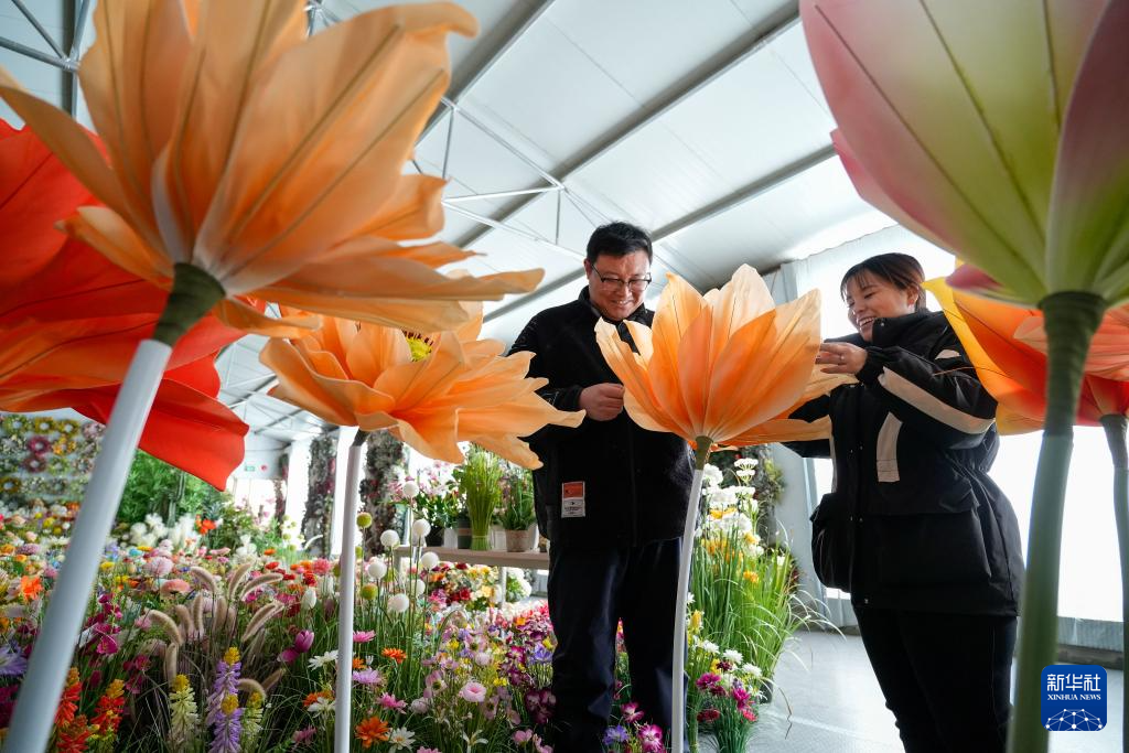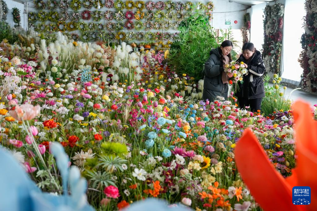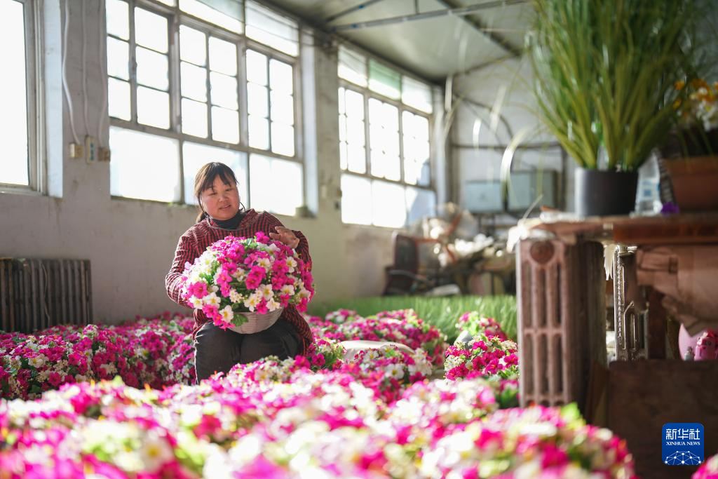 1月16日,乐亭县一家绢花生产企业的工作人员在打理绢花花束。