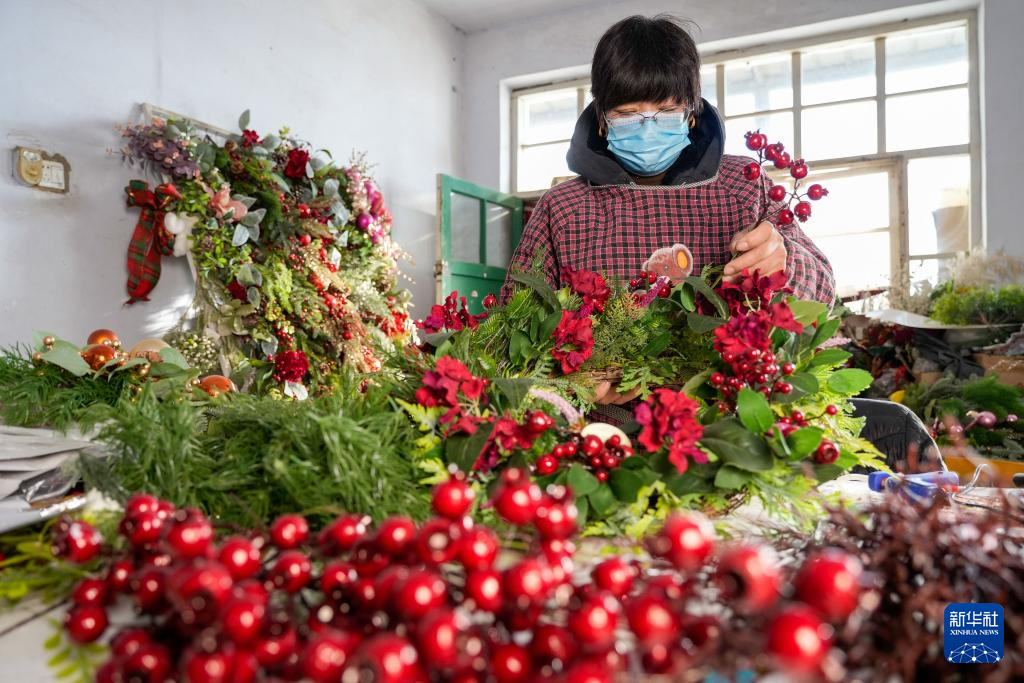 1月16日,乐亭县一家绢花生产企业的工作人员在制作绢花花环。