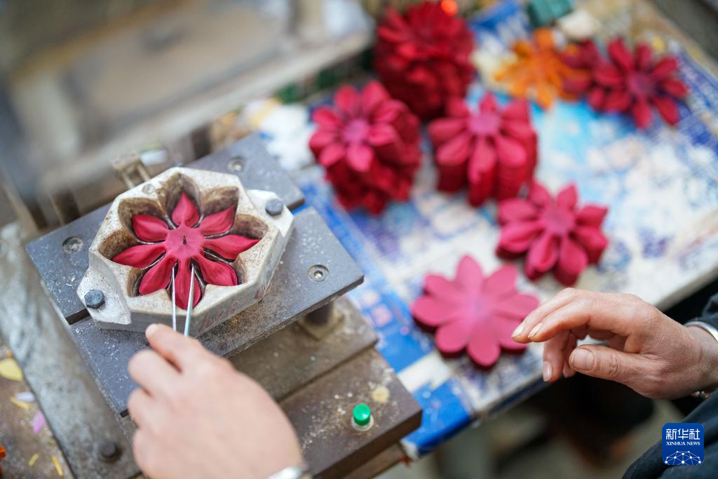 1月16日,乐亭县一家绢花生产企业的工作人员在制作绢花产品。