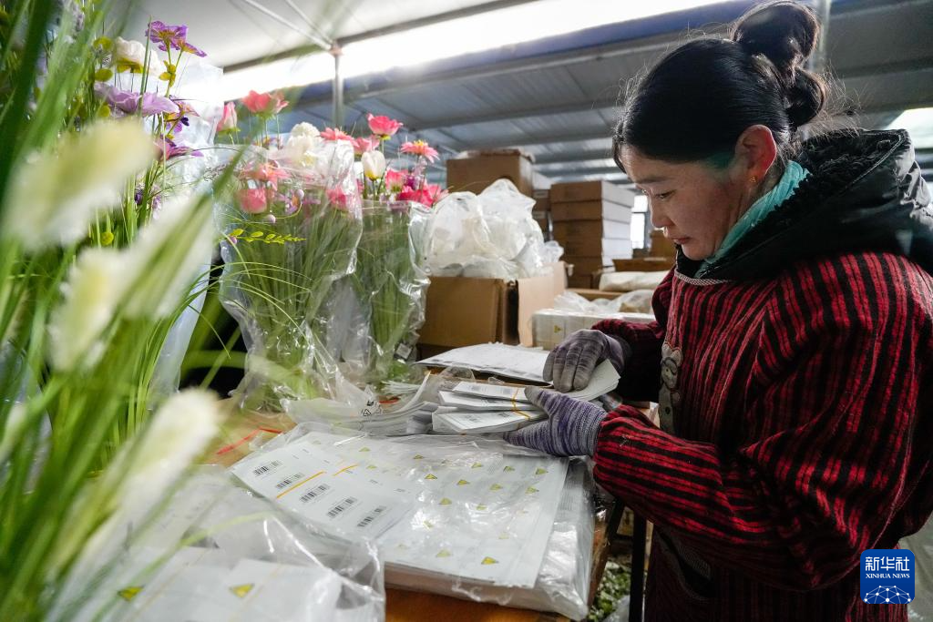 1月16日,乐亭县一家绢花生产企业的工作人员在包装绢花产品。