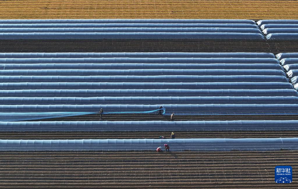2月28日,河北省唐山市丰南区岔河镇三神庄村农民为播种好的马铃薯覆膜(无人机照片)。新华社记者杨世尧摄