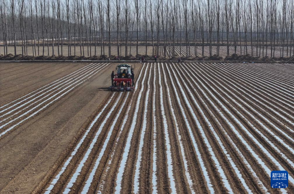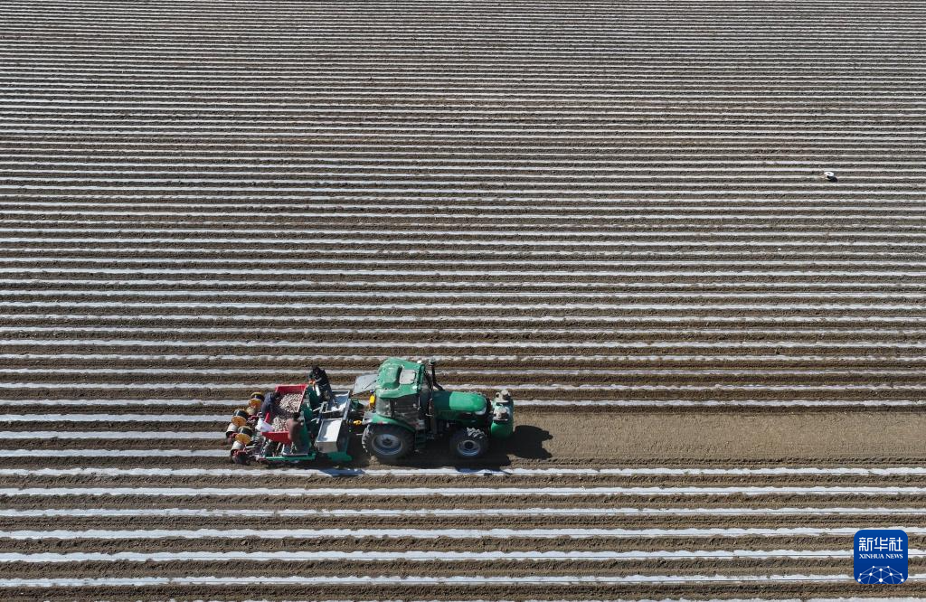 3月14日,河北省唐山市曹妃甸区第八农场的农民在田间播种马铃薯(无人机照片)。