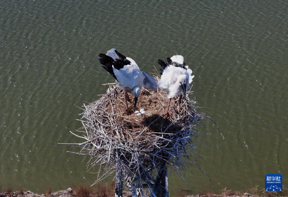 3月20日,东方白鹳在唐山市丰南区黑沿子镇沿海湿地的鸟巢中孵化鸟宝宝。 新华社记者杨世尧摄