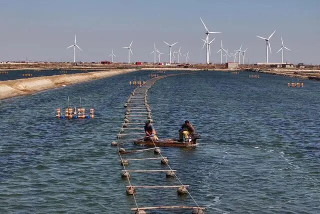 3月23日,在乐亭县姜各庄镇海参养殖基地,工人在露天养殖池内修理海参养殖设施(无人机照片)。新华社记者 杨世尧 摄