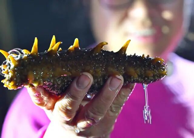 3月23日,在乐亭县姜各庄镇海参养殖基地,工人在养殖棚内展示收获的海参。新华社记者 杨世尧 摄