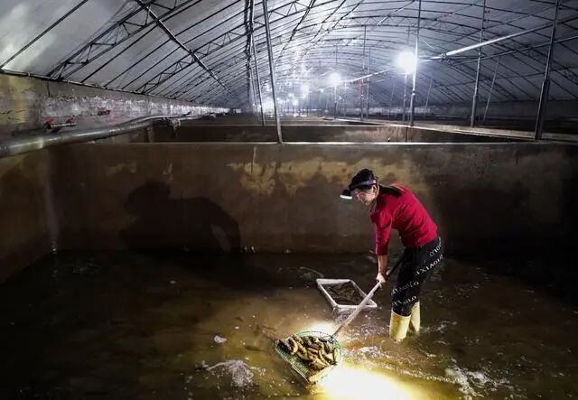 3月23日,在乐亭县姜各庄镇海参养殖基地,养殖户在养殖棚内收获海参。新华社记者 杨世尧 摄