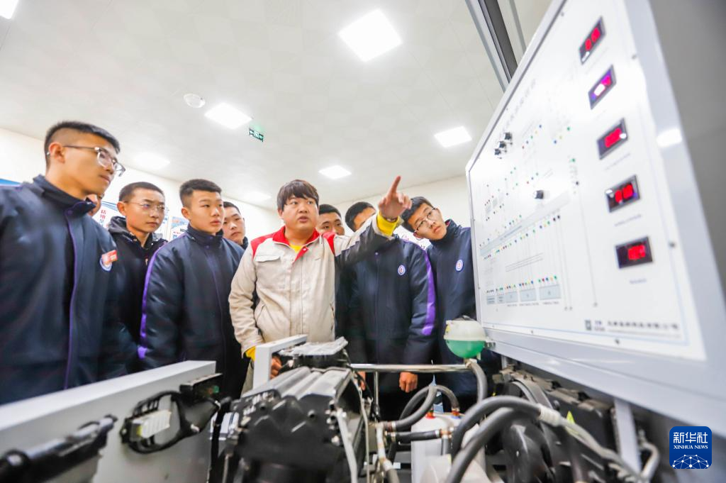 3月28日,河北省遵化市职业教育联合学校的老师在给学生讲解汽车空调工作原理。