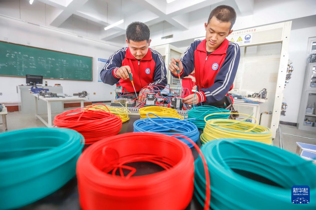 3月28日,河北省遵化市职业教育联合学校的学生在实训室安装电气控制设备。