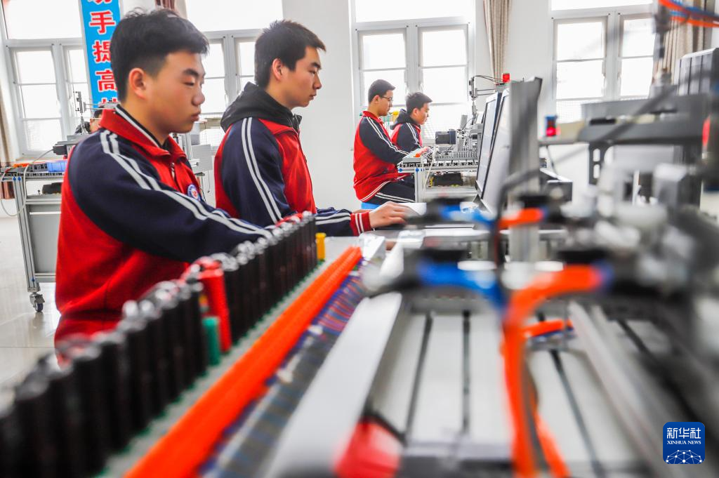 3月28日,河北省遵化市职业教育联合学校的学生在机电一体化实训室进行编程操作。